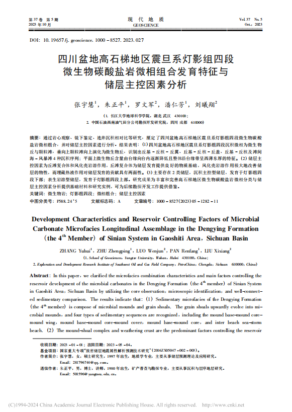 伟德国际1949官网地科系教师朱正平博士在石油地质学领域主流期刊《现代地质》上发表题为“四川盆地高石梯地区震旦系灯影组四段微生物碳酸盐岩微相组合发育特征与储层主控因素分析”的研究论文。