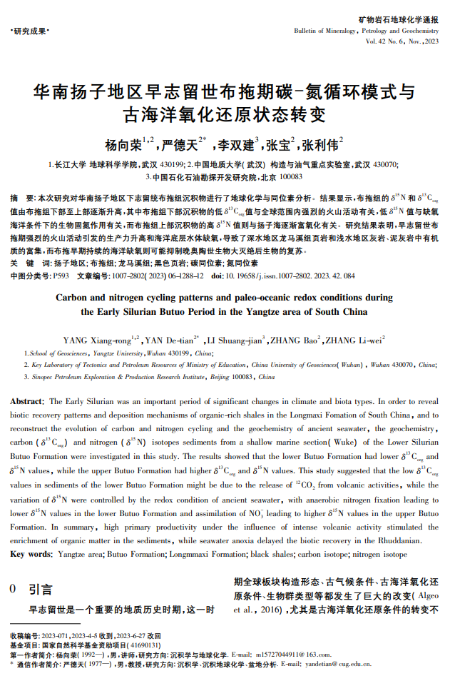 伟德国际1949官网地质系教师杨向荣在地学核心期刊《矿物岩石地球化学通报》上发表题为“华南扬子地区早志留世布拖期碳-氮循环模式与古海洋氧化还原状态转变”的研究论文。