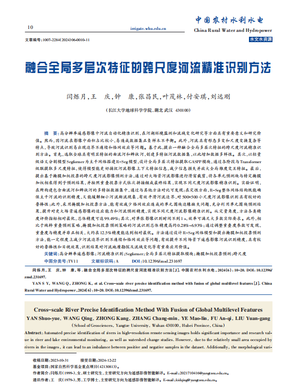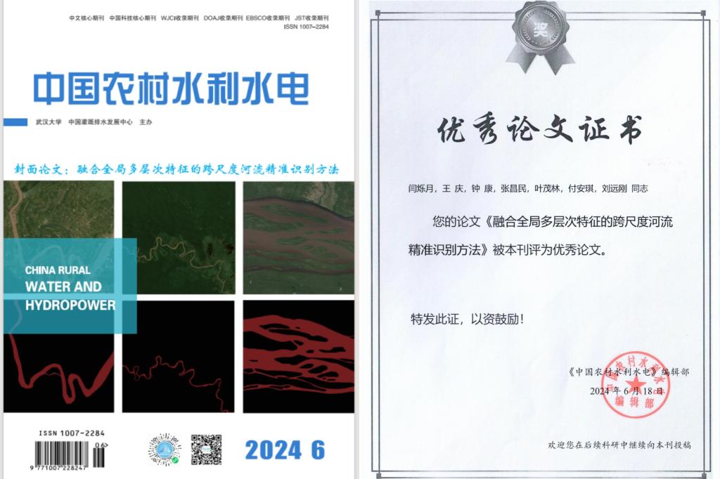 伟德国际1949官网地信系硕士研究生闫硕月(指导老师:王庆)在《中国农村水利水电》上发表题为“融合全局多层次特征的跨尺度河流精准识别方法”的研究论文。该论文被该期刊评为优秀论文,并作为2024年第6期的封面论文。