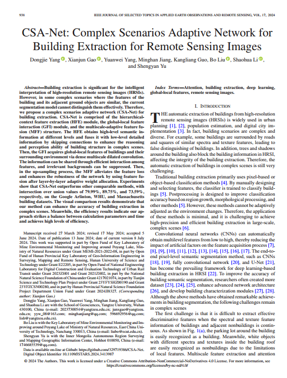 地科学院杨栋杰博士在郭康良教授和高贤君副教授的指导下,在成像科学和摄影技术主流期刊《IEEE JOURNAL OF SELECTED TOPICS IN APPLIED EARTH OBSERVATIONS AND REMOTE SENSING》上发表题为“CSA-Net: Complex Scenarios Adaptive Network for Building Extraction for Remote Sensing Images”的研究论文。