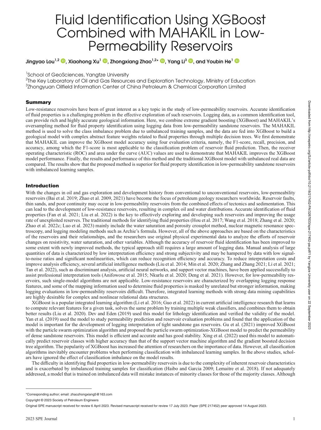 地科学院娄静瑶博士在石油领域重要期刊《SPE JOURNAL》上发表题为“Fluid Identification Using XGBoost Combined with MAHAKIL in Low- Permeability Reservoirs”的研究论文。伟德国际1949官网为论文第一署名单位,研究生娄静瑶为论文第一作者,赵仲祥副教授为该文通讯作者。本项研究得到国家重大科技专项和国家自然科学基金共同资助。