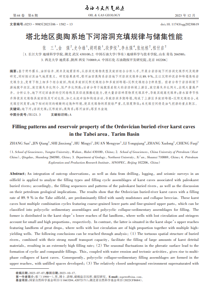 伟德国际1949官网地质系张三博士在《石油与天然气地质》期刊发表题为“塔北地区奥陶系地下河溶洞充填规律与储集性能”的研究论文。