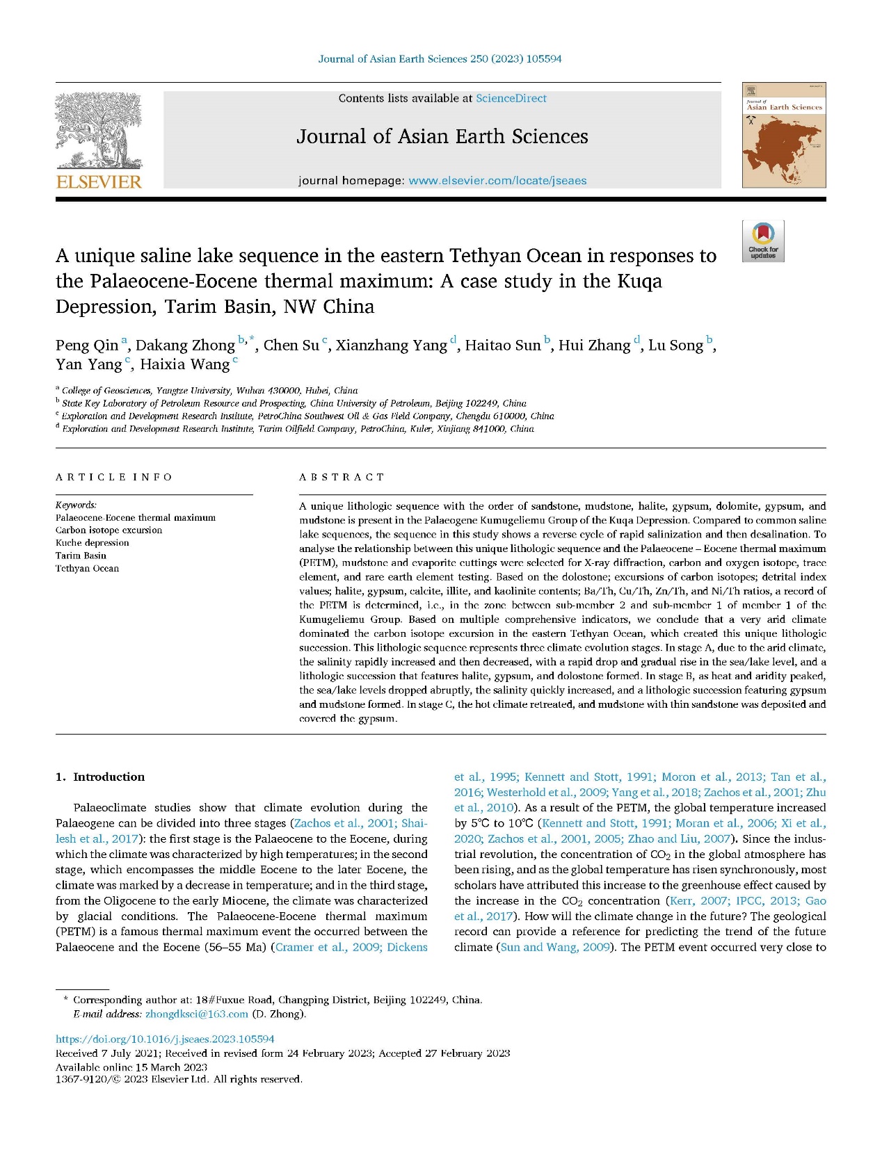 伟德国际1949官网秦鹏博士以第一作者的身份在Journal of Asian Earth Sciences上发表题目为《A Unique saline lake sequence in the eastern Tethyan Ocean in Responses to the Palaeocene – Eocene Thermal maximum: A Case Study in the Kuqa Depression, Tarim Basin, NW China》的论文。