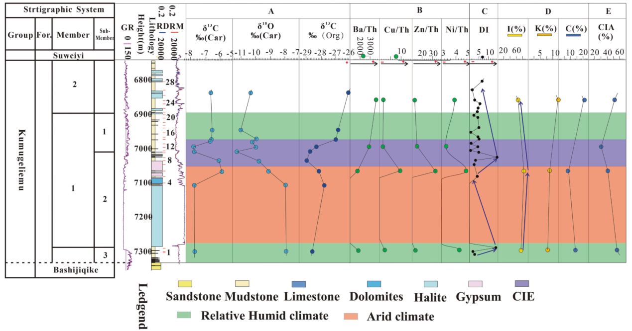 古新世-始新世之交极热气候事件(PETM)是距今最近、最为显著的全球增温事件,对了解极热温室气候条件下,全球气候环境变化具有重要意义,国际学术界将其视为现今全球气候变化的对比实例。库姆格列木群为一套对气候变化敏感的盐湖沉积,保存有完整的古新世-始新世的沉积记录,是研究古气候的良好载体。但因缺乏凝灰岩沉积致使对PETM缺乏定年研究。通过利用古生物化石定年和碳同位素负偏特征,厘定了碳同位素负偏区间(CIE),综合古气候指标、古盐度指标、古生产力指标以及岩性序列特征,认为极热气候演化具有三个阶段:初始阶段,峰值阶段和退化阶段。盐湖环境中由泥岩-盐岩-膏岩-白云岩-膏岩-泥岩的岩性序列对极热气候演化具有响应。初始阶段,气候逐渐干旱化并伴随着间歇性的海侵,海平面快速下降,水体盐度先快速升高,对应沉积盐岩和膏岩,间歇性的海侵带来了短暂的水汽,气候相对湿润,海平面升高,水体盐度暂时降低,沉积颗粒灰岩、晶粒白云岩和颗粒白云岩,对应沉积由盐岩-膏岩-白云岩的沉积序列;峰值阶段,气温迅速升高,海平面迅速降低,盐度快速升高,石膏沉淀,形成膏岩-红色泥岩的序列;退化阶段,气候逐渐湿润,淡水注入多,沉积一套泥岩。