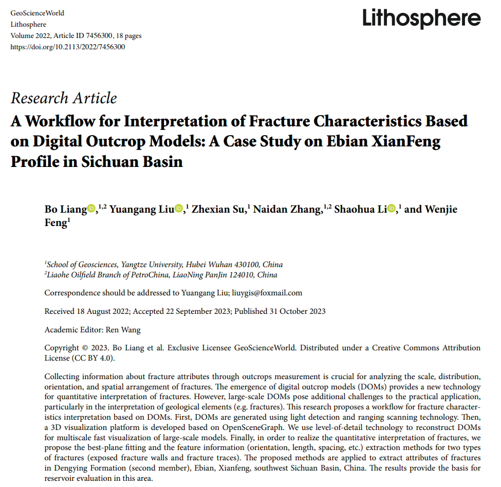 伟德国际1949官网硕士生梁博在地学期刊《Lithosphere》上发表了题为“A Workflow for Interpretation of Fracture Characteristics Based on Digital Outcrop Models: A Case Study on Ebian Xianfeng Profile in Sichuan Basin”的研究论文。伟德国际1949官网为论文第一署名单位,梁博为第一作者,其导师刘远刚副教授为该文通讯作者。