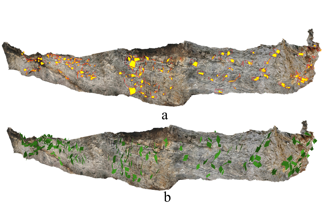 研究结果表明,构建数字露头LOD模型可以实现大规模模型在内存中的动态调度与分级显示;基于三维数字露头模型的裂缝线状和面状结构面特征参数获取方法能够有效应用于大规模数字露头模型的裂缝特征解译。该研究为虚拟露头裂缝解译提供了有力的技术支撑,并促进地质学家对该项技术在特定研究中潜在应用价值的探索,对裂缝型油藏勘探开发具有重要的实际意义。