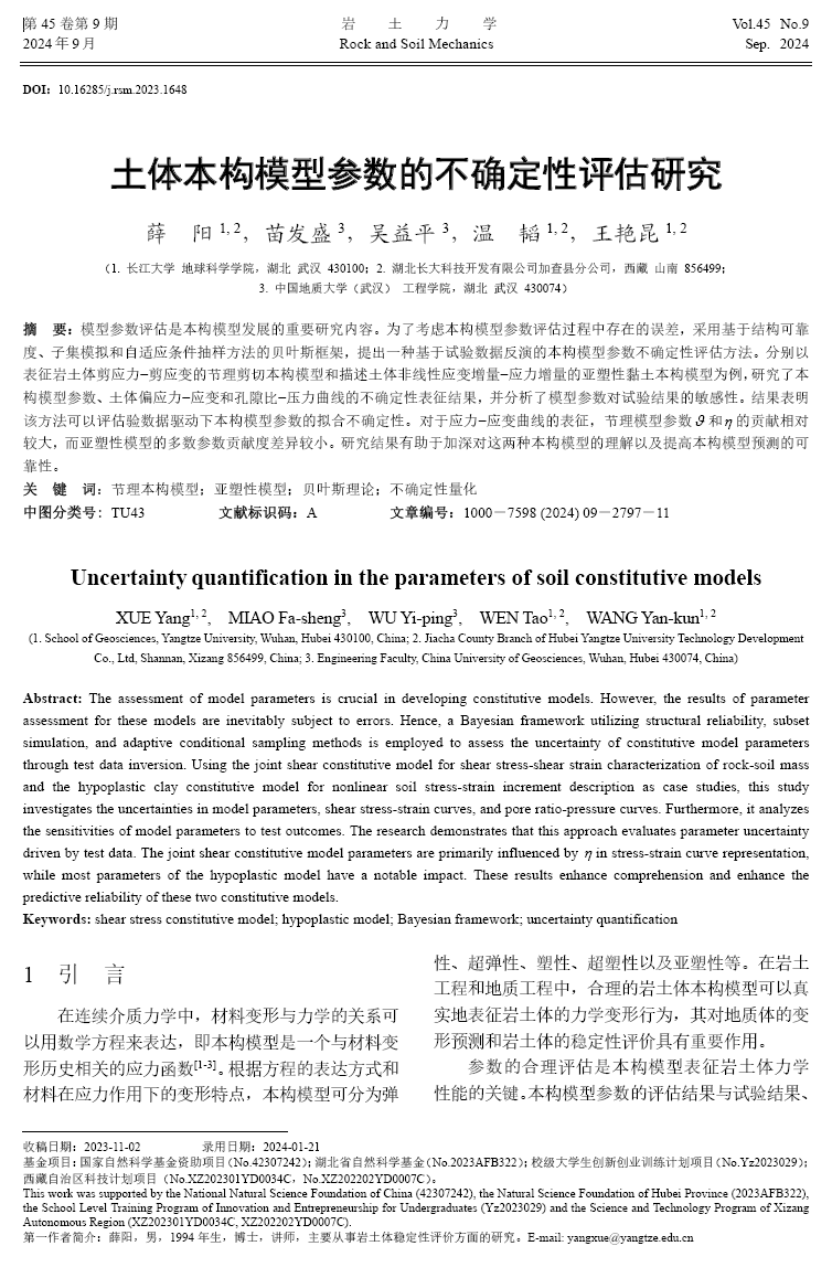 地科学院地质系教师薛阳博士以第一作者身份在《岩土力学》上发表论文。《岩土力学》为中国核心、EI收录期刊;2019年,《岩土力学》入选中国科技期刊卓越行动计划梯队期刊;2023年中国岩石力学与工程领域唯一入选ESCI的中文期刊,获得第一个JCR影响因子1.5;JCR分区Q3(信息来源官网)。本项研究得到了国家自然科学基金项目和西藏自治区科技项目的资助。