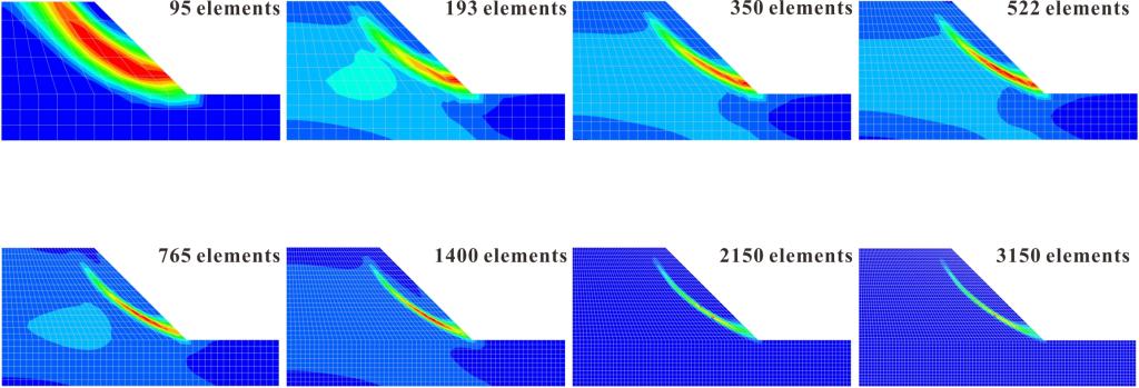 图2 不同网格尺寸下边坡的滑面分布、边坡位移场的分布特征