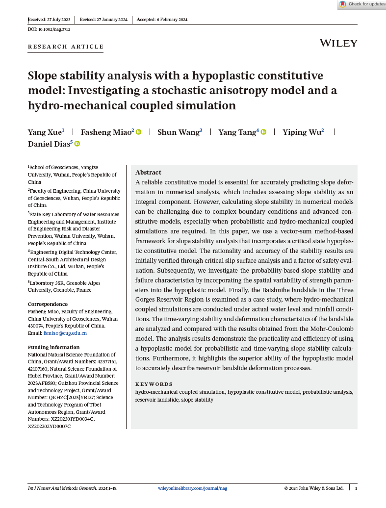 地科学院地质系教师薛阳博士以第一作者身份在计算机岩土领域老牌期刊《International Journal for Numerical and Analytical Methods in Geomechanics》上发表题为“Slope stability analysis with a hypoplastic constitutive model: investigating a stochastic anisotropy model and a hydro-mechanical coupled simulation”的论文。本项研究得到了国家自然科学基金项目和西藏自治区科技项目的资助。