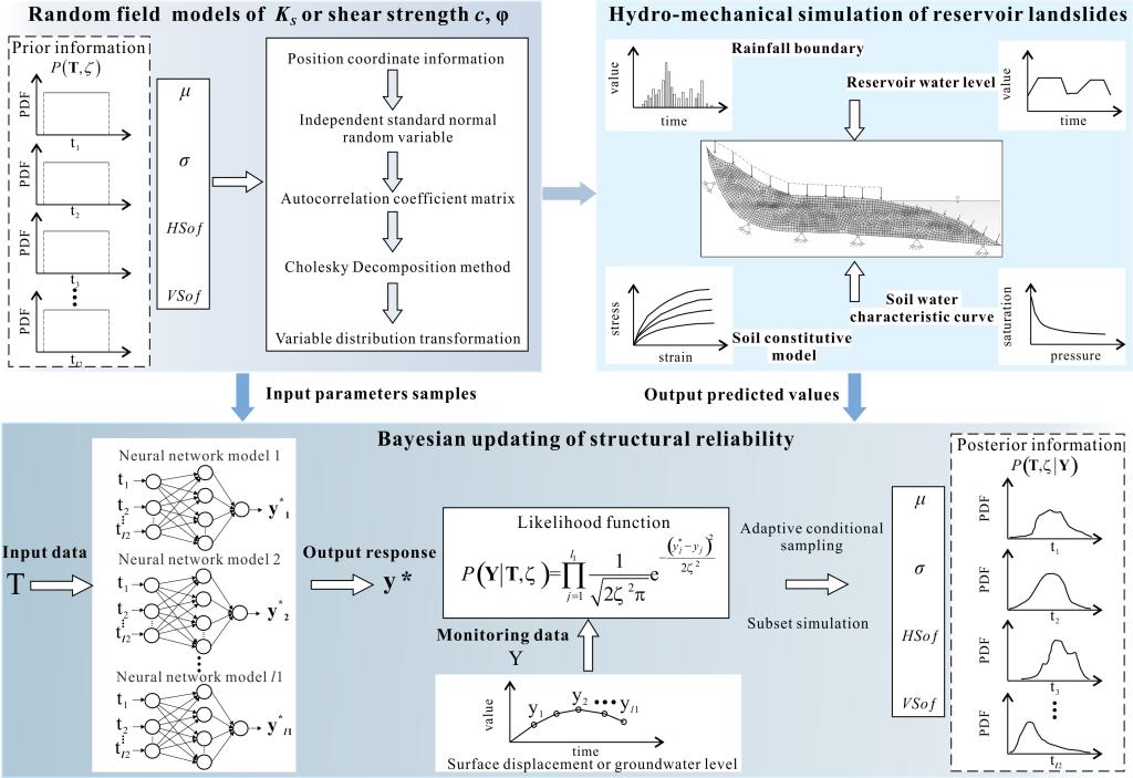 精确评估统计参数以描述岩土体空间变异性是边坡稳定性概率分析中的一项挑战。概率反演分析是一种有效可靠的技术,它为利用观测数据反演土体参数提供了一种合理的途径。然而,以往用于边坡稳定性分析的参数反演研究很少考虑库岸滑坡的水力耦合特性。本研究提出了一种考虑综合水力参数空间变异性的贝叶斯框架(图1),利用地下水位和地面位移的实地监测数据对库岸滑坡进行随机场参数反演分析。在此框架内,采用亚塑性本构模型来描述库岸滑坡的“阶跃型”变形。以位于三峡库区库岸滑坡为例(图2),通过对空间变异参数的反演分析和滑坡概率稳定性分析,验证了所提出的框架。
