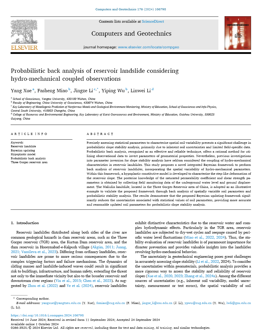 地科学院地质系教师薛阳博士主要研究兴趣为滑坡稳定性评价、灾害机理分析和岩土不确定性量化。以第一作者身份在计算机岩土领域顶级期刊《Computers and Geotechnics》(平均影响因子5.7,JCR分区1区)上发表题为“Probabilistic back analysis of reservoir landslide considering hydro-mechanical coupled observations”的论文。本项研究得到了国家自然科学基金项目、西藏自治区科技项目和青海省科技项目的资助。