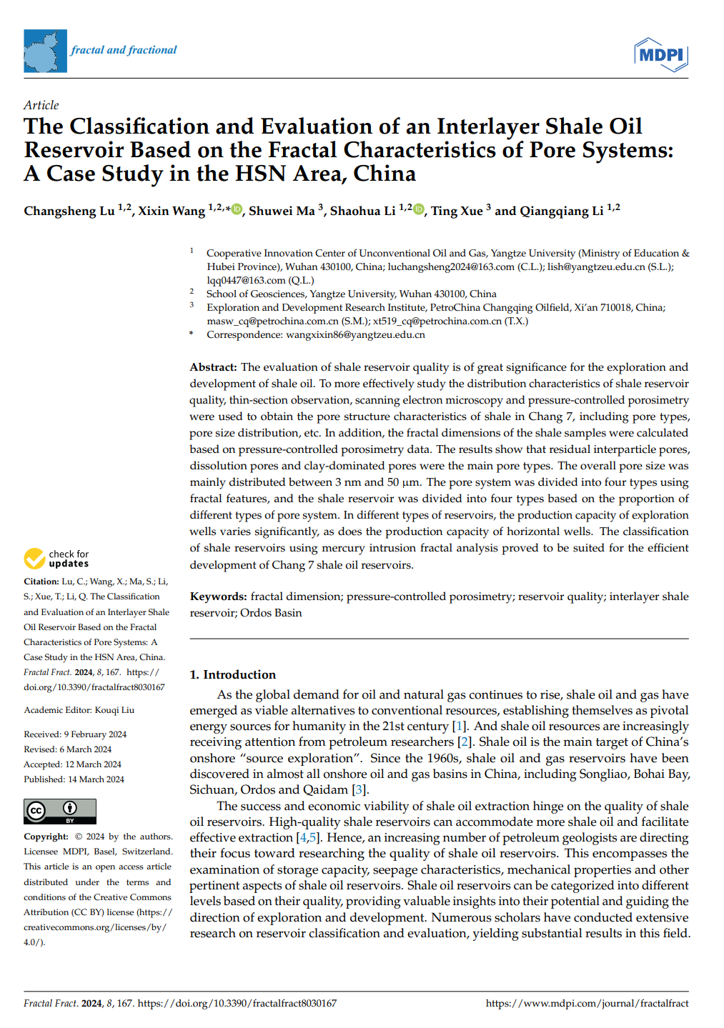 伟德国际1949官网石油系王喜鑫博士在石油地质学领域主流期刊《Fractal and fractional》上发表题为“TheClassiffcationand Evaluation of an Interlayer Shale Oil Reservoir Based on the Fractal Characteristics of Pore Systems: A Case Study in the HSN Area, China”的研究论文。