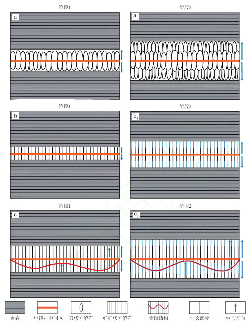 a,a1.分别为反轴刃状方解石脉早期和晚期阶段;b,b1.分别为反轴纤维状方解石脉早期和晚期阶段;c,c1.分别为反轴方解石脉早期和结晶扩展晚期叠锥结构阶段
