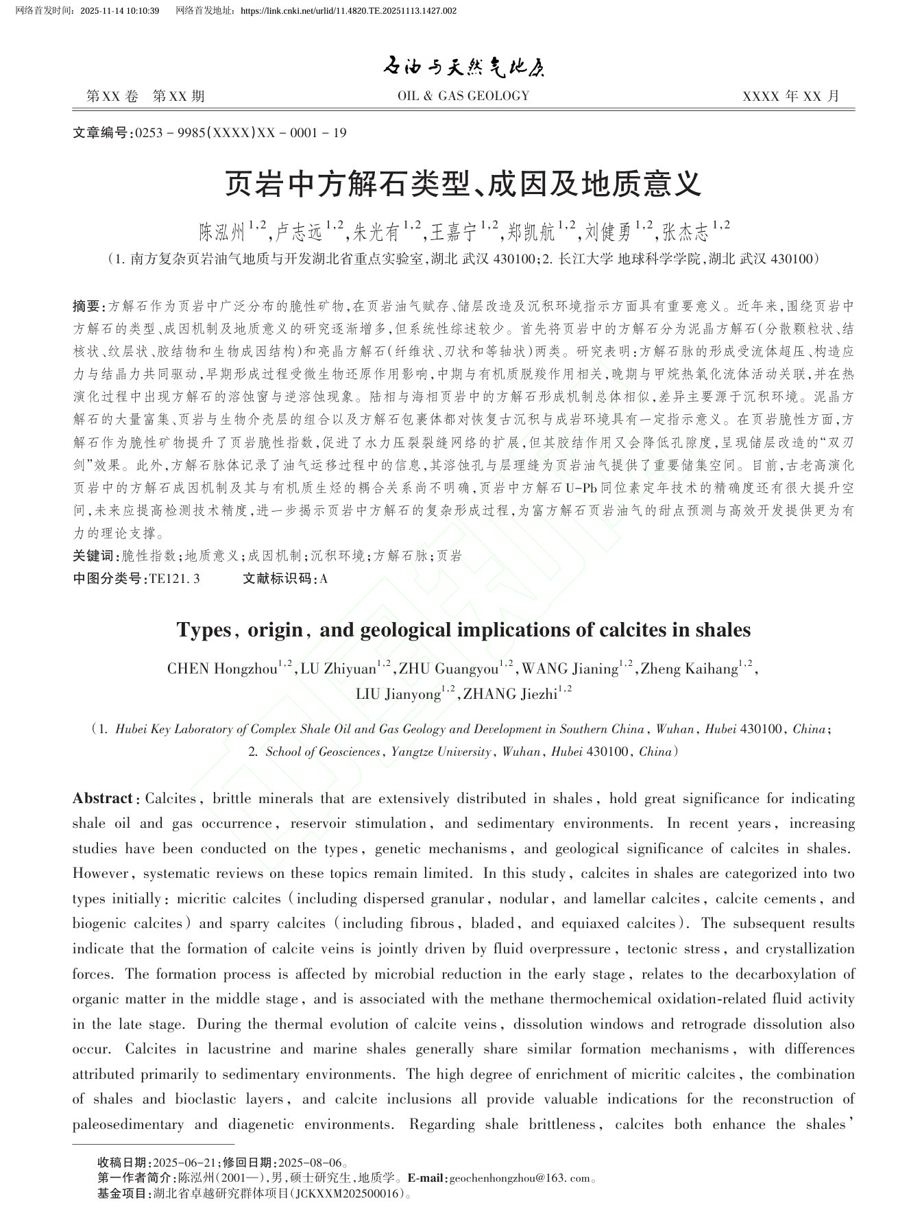 近日,地科学院2024级地质学专业硕士生陈泓州以第一作者身份在中文EI检索期刊《石油与天然气地质》(影响因子7.149)上发表题为“页岩中方解石类型、成因及地质意义”的研究论文。伟德国际1949官网为论文第一署名单位,硕士生陈泓州为论文第一作者,其导师朱光有教授为论文通讯作者。
