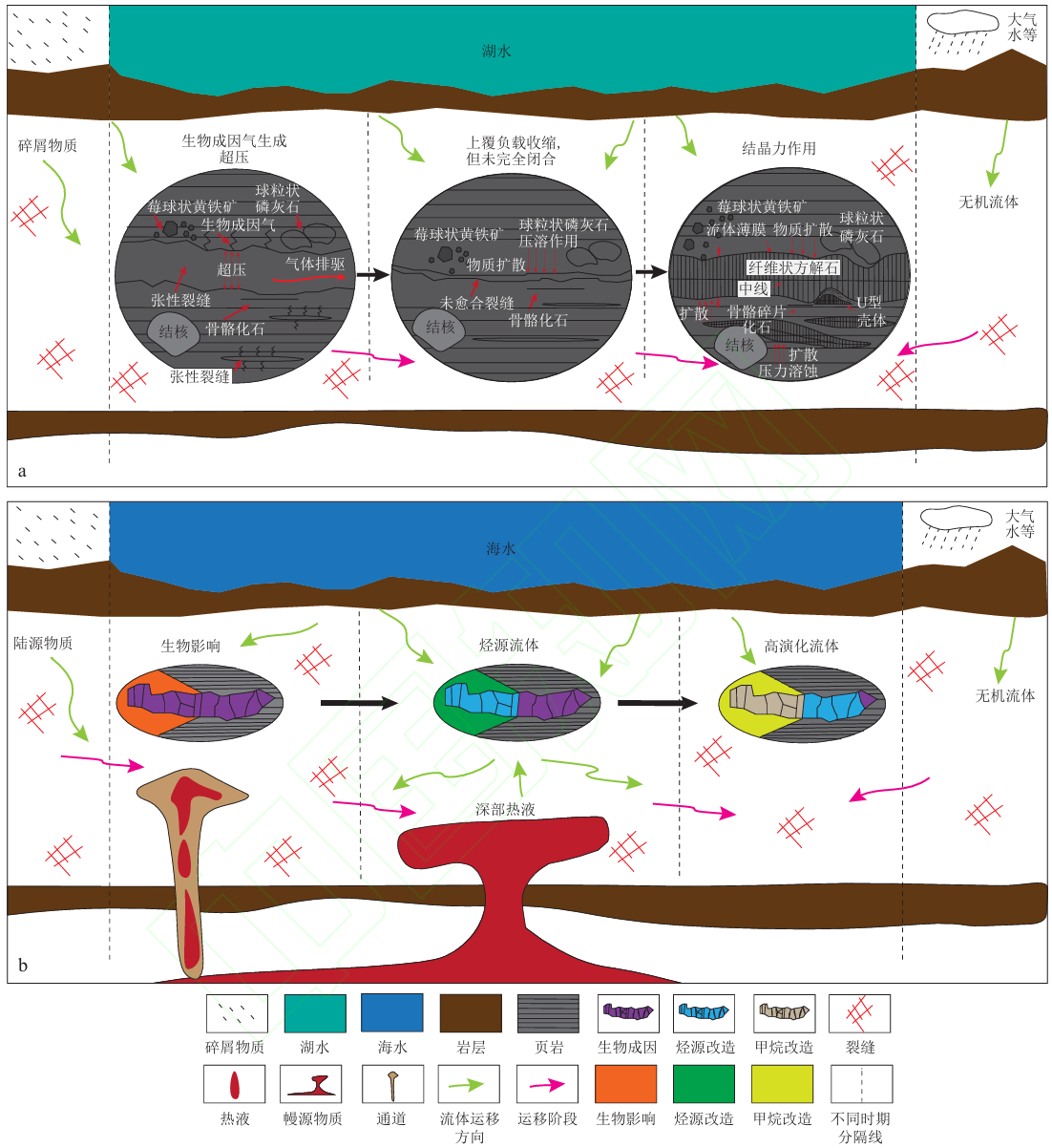 图3 陆相页岩(a)和海相页岩(b)中方解石脉的形成过程