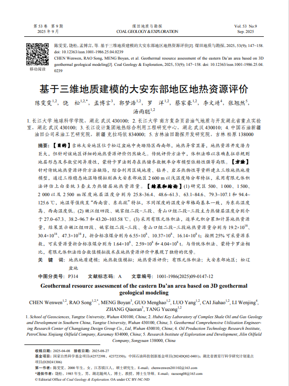 地科学院硕士生陈雯雯在饶松教授的指导下,在期刊《煤田地质与勘探》上发表题为“基于三维地热地质建模的大安东部地区地热资源评价”的研究论文,伟德国际1949官网为论文第一署名单位,硕士生陈雯雯为论文第一作者,其导师饶松教授为该文通讯作者。