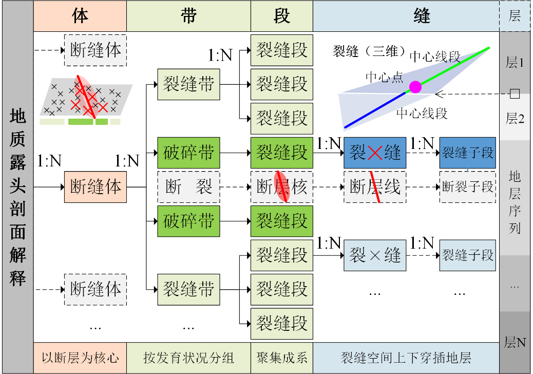 论文致力于为地质露头设计空间数据结构,对野外露头剖面的地质解释结果进行结构化组织与管理,以参数化、定量化的描述对断缝体及其组成要素进行精细刻画,设计并开发知识库软件平台进行数据挖掘与统计制图,实现了一套较为完整的断缝体露头地质知识库的建设方法。应用结果表明,本文提出的“体—带—段—缝”层次结构与面向对象的知识库建设框架可有效实现断缝体露头地质解释结果的结构化管理与可视化分析,可为识别断缝体规模与成因、描述裂缝发育展布与空间配置关系、储层建模与勘探开发提供决策依据。