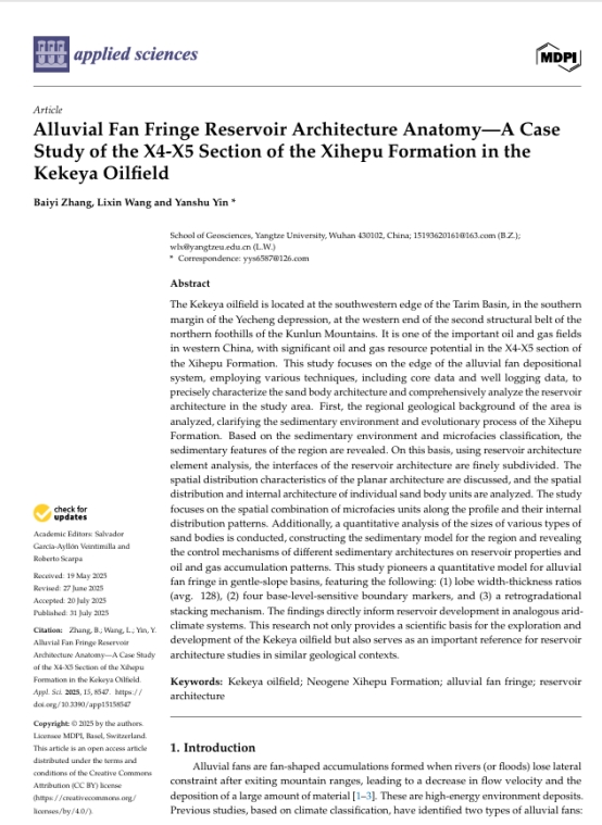 伟德国际1949官网硕士生张佰义在SCI收录期刊《Applied Sciences》上发表题为“Alluvial Fan Fringe Reservoir Architecture Anatomy — A Case Study of the X4-X5 Section of the Xihepu Formation in the Kekeya Oilfield”的研究论文。伟德国际1949官网为论文第一署名单位,张佰义为论文第一作者,尹艳树教授为通讯作者。