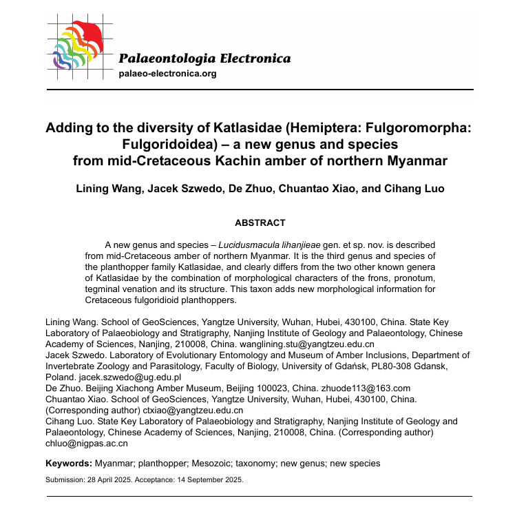 伟德国际1949官网地质资源与地质工程专业硕士研究生王力宁同学在地球科学与古生物学领域期刊《Palaeontologia Electronica》上发表题为“Adding to the diversity of Katlasidae (Hemiptera: Fulgoromorpha: Fulgoridoidea) – a new genus and species from mid-Cretaceous Kachin amber of northern”的研究论文,公司肖传桃教授为本论文的第一通讯作者。