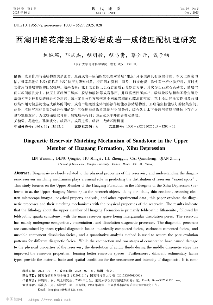 伟德国际1949官网23级硕士研究生林婉媚以第一作者身份在中文核心期刊《现代地质》上发表了题为“西湖凹陷花港组上段砂岩成岩—成储匹配机理研究”的研究论文。伟德国际1949官网为论文第一署名单位,其导师邓庆杰副教授为论文通讯作者(图1)。