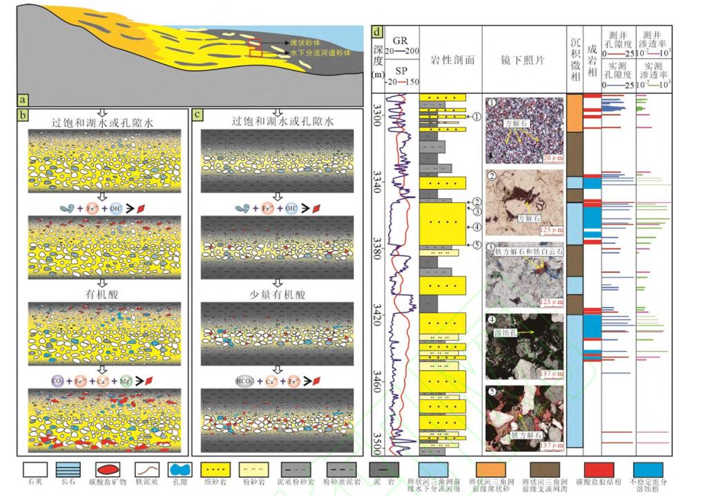 论文以西湖凹陷花港组上段砂岩储层为研究对象,综合运用岩心、薄片、扫描电镜及物性分析等大量实验数据,探讨了砂岩储层的岩石学特征、成岩作用过程及储层物性演化,建立了成岩相孔隙演化模式。研究表明,花上段储层以富塑性压实相、碳酸盐胶结相和不稳定组分溶蚀相等3种典型的成岩相为约束,溶蚀相在中成岩阶段形成大量次生孔隙,是研究区的主要有效储层。压实相和胶结相则多导致孔隙丧失,储层物性较差。沉积环境为成岩作用的发生和强度提供物质基础与空间条件:水下分流河道厚层砂体因其开放的成岩体系和优越的流体运移条件,利于溶蚀作用的发生和溶蚀产物的迁出,从而在砂体中部形成物性良好的优质储层;而席状砂体则因体系封闭,普遍被胶结物充填,储层物性差(图2),在此基础上,建立了成岩-成储演化模式。研究成果不仅深化了对该区储层非均质性的认识,也为优质储层预测与后续油气开发提供了理论依据。