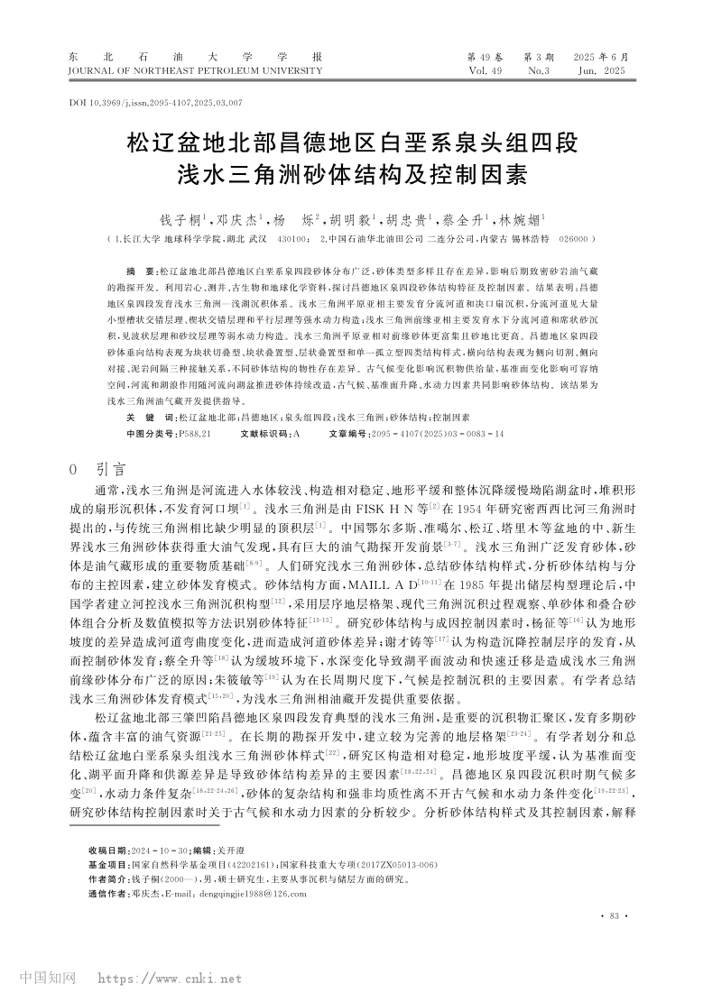 伟德国际1949官网23级硕士研究生钱子桐以第一作者身份在中文核心期刊《东北石油大学学报》发表题为“松辽盆地北部昌德地区白垩系泉头组四段浅水三角洲砂体结构及控制因素”的研究论文。伟德国际1949官网为论文第一署名单位,其导师邓庆杰副教授为论文通讯作者(图1)。