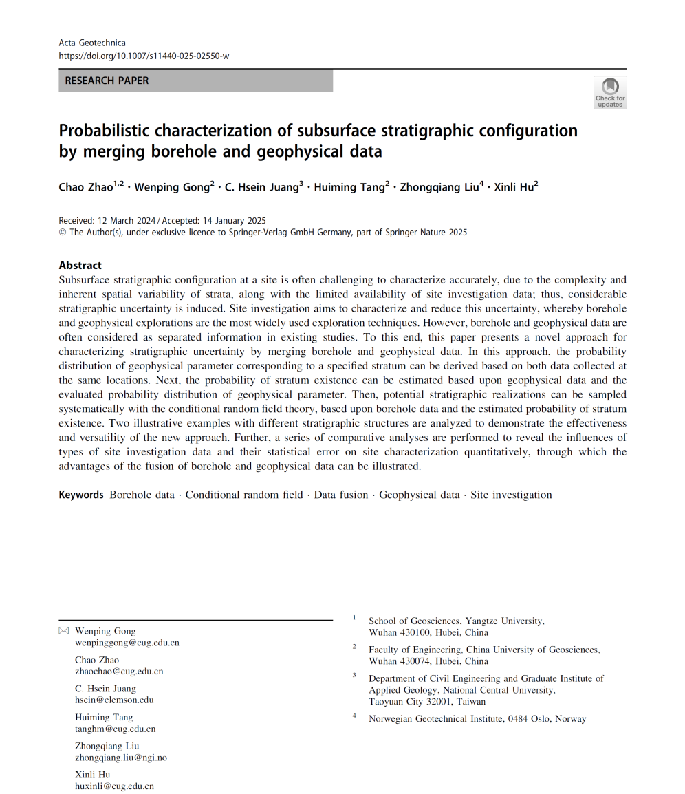 伟德国际1949官网特任教授赵超在《Acta Geotechnica》发表题为“Probabilistic characterization of subsurface stratigraphic configuration by merging borehole and geophysical data”的研究论文(图1)。赵超为第一作者,伟德国际1949官网为第一完成单位。