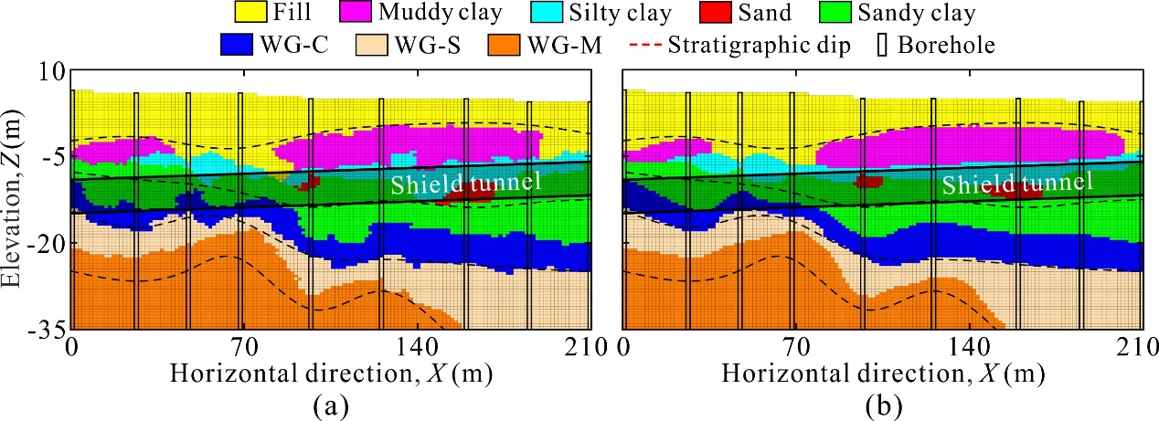 论文以某实际工程隧道为研究对象,综合考虑了地层空间变异性、岩土参数随机性及其空间相关特征(图2),系统分析了不同不确定性因素对隧道衬砌内力、地表沉降及结构可靠度的影响规律(图3)。研究结果表明:相较于仅考虑岩土参数不确定性的传统方法,同时引入地层结构不确定性可显著改变隧道结构响应与失效概率分布特征,对隧道安全评价具有关键影响;在复杂地层条件下,地层结构不确定性甚至成为主导控制因素。