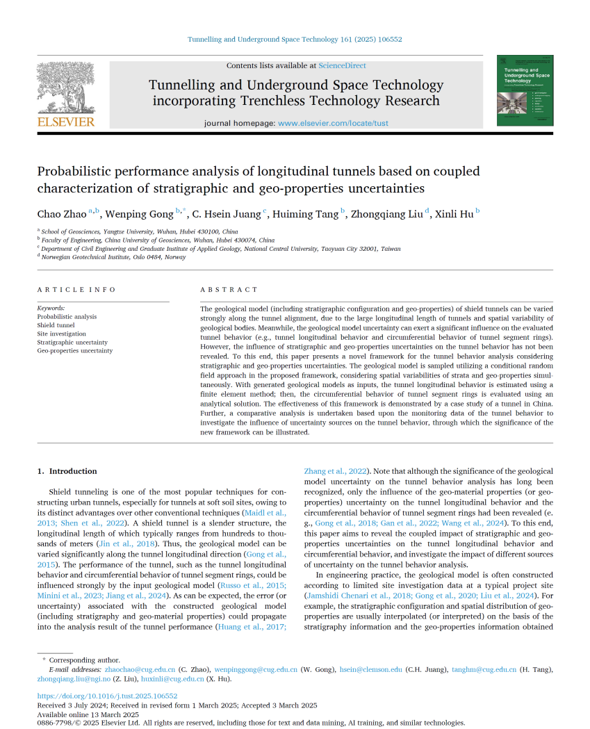 伟德国际1949官网特任教授赵超在《Tunnelling and Underground Space Technology》发表题为“Probabilistic performance analysis of longitudinal tunnels based on coupled characterization of stratigraphic and geo-properties uncertainties”的研究论文(图1)。赵超为第一作者,伟德国际1949官网为第一完成单位。