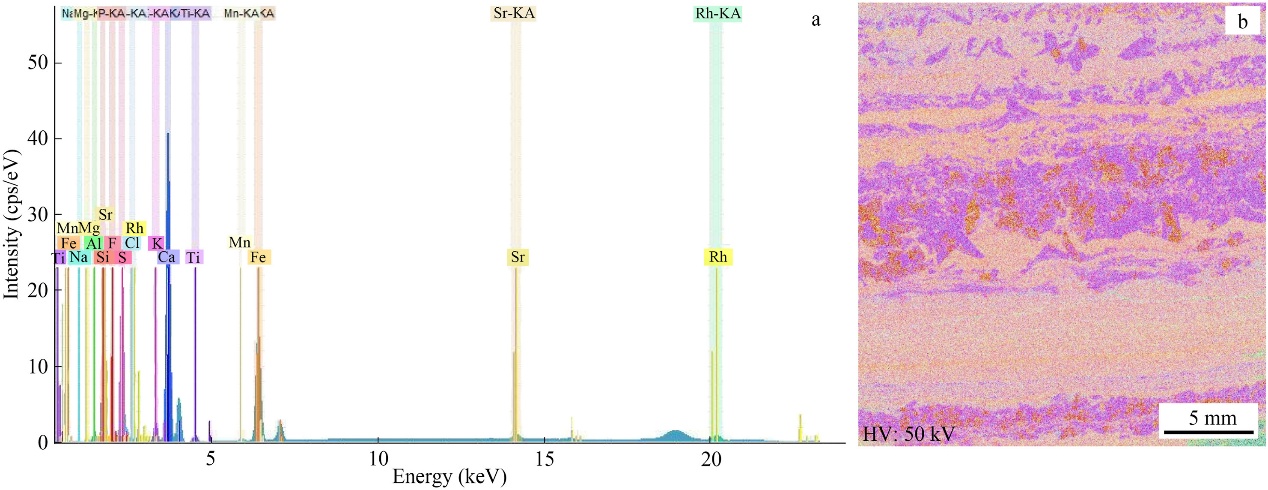 图3 页岩样品(东濮凹陷)X射线荧光光谱分析(XRF)谱图(a)与面扫描成果图(b)