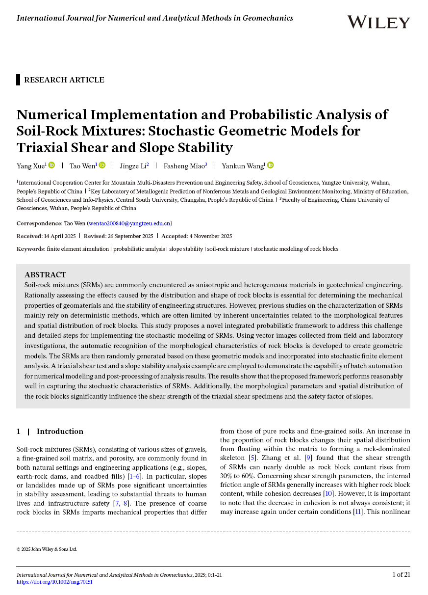 伟德国际1949官网地质系、工程地质研究中心团队成员薛阳副教授在老牌期刊《International Journal for Numerical and Analytical Methods in Geomechanics》(位列JCR分区一区,中科院大类二区)上发表题为“Numerical Implementation and Probabilistic Analysis of Soil-Rock Mixtures: Stochastic Geometric Models for Triaxial Shear and Slope Stability”的论文(图1),薛阳副教授为第一作者,温韬教授为通讯作者,伟德国际1949官网为第一完成单位。