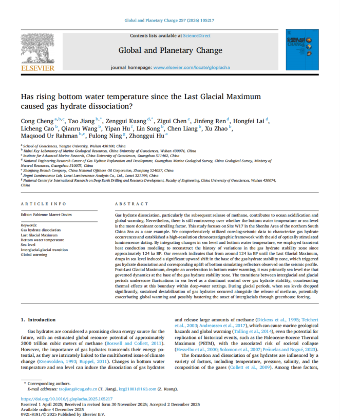 伟德国际1949官网地质系、深层碳酸盐岩与非常规油气储层研究中心团队成员程聪特任副教授在中科院一区TOP期刊《Global and Planetary Change》发表题为“Has rising bottom water temperature since the Last Glacial Maximum caused gas hydrate dissociation?”的研究论文(图1)。程聪为第一作者,伟德国际1949官网为第一完成单位。