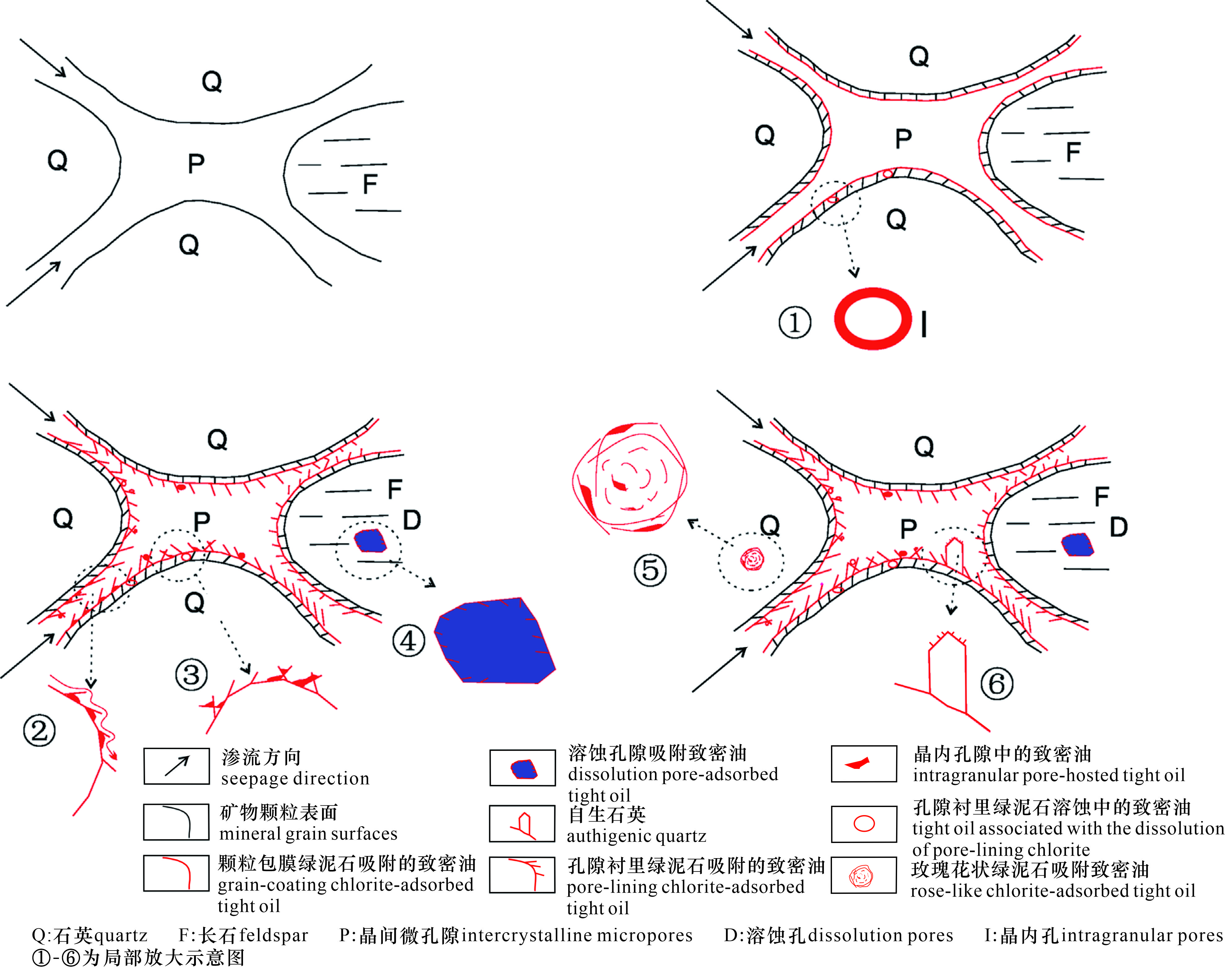 图5 自生绿泥石对烃类充注过程中致密油微观赋存的过程