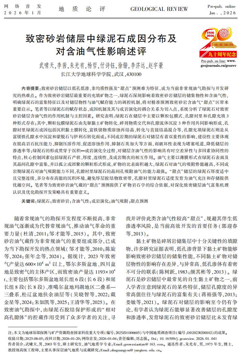 近日,地科学院2025级资源与环境专业硕士生武啸天以第一作者身份在中文核心期刊《地质论评》上发表题为“致密砂岩储层中绿泥石成因分布及对含油气性影响述评”的研究论文(图1)。硕士生武啸天为论文第一作者,其导师朱光有教授为论文通讯作者,伟德国际1949官网为第一完成单位。