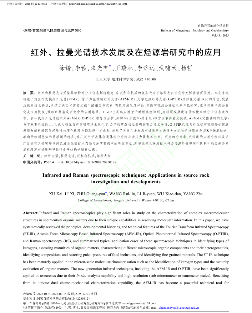 地科学院2025级地质学专业硕士生徐锴以第一作者身份在中文核心期刊《矿物岩石地球化学通报》上发表题为“红外、拉曼光谱技术发展及在烃源岩研究中的应用”的研究论文。伟德国际1949官网为论文第一署名单位,硕士生徐锴为论文第一作者,其导师朱光有教授为论文通讯作者。