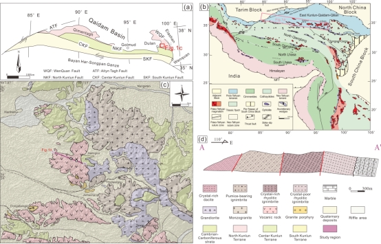 图2 东昆仑造山带大地构造简图(a);研究区及其周缘构造分布简图(b);研究区地质简图(c)、富晶体和贫晶体火山岩的代表性地质剖面图(A-A')(d)