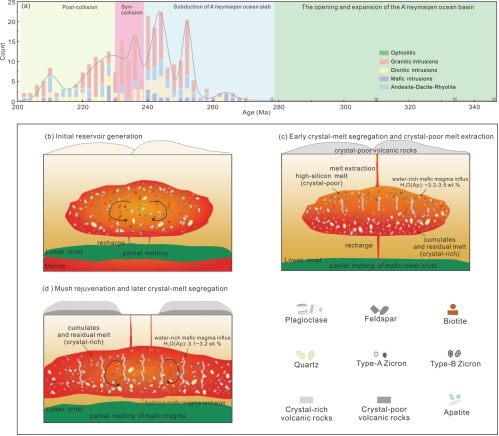 综合本次矿物学与岩石学研究成果以及区域最新多学科研究资料,重建了都兰地区三叠纪长英质岩浆储库系统所经历的两阶段晶体-熔体分离历史。其中,早期高硅熔体抽取形成贫晶体火山岩,而晚期在更加显著的基性岩浆和含水流体共同作用下,晶粥体被重新加热和活化,最终形成富晶体火山岩(图4)。