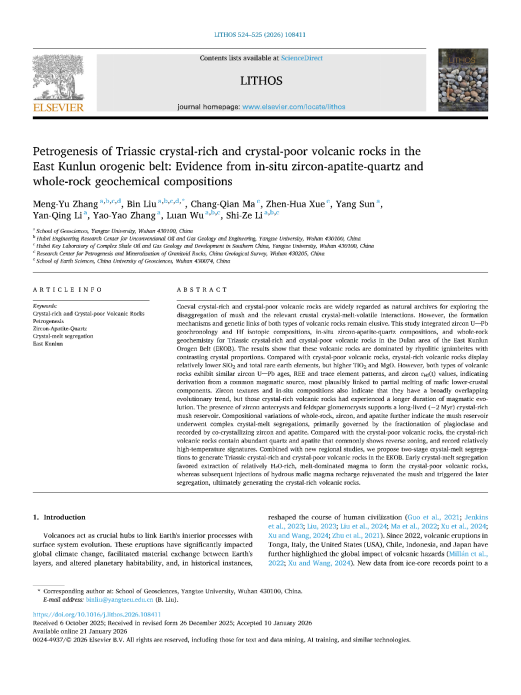 地科学院2023级地质学硕士研究生张萌雨以第一作者身份在中科院二区TOP期刊《Lithos》上发表了题为“Petrogenesis of Triassic crystal-rich and crystal-poor volcanic rocks in the East Kunlun orogenic belt: Evidence from in-situ zircon-apatite-quartz and whole-rock geochemical compositions”的研究论文(图1)。伟德国际1949官网为论文第一署名单位、通讯作者单位,硕士生张萌雨为论文第一作者,其导师刘彬教授为论文通讯作者。