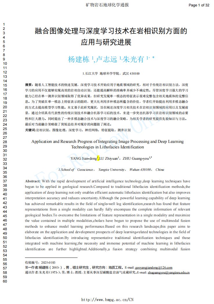 地科学院2025级地质工程专业硕士生杨建栋以第一作者身份在中文核心期刊《矿物岩石地球化学通报》上发表题为《融合图像处理与深度学习技术在岩相识别方面的应用与研究进展》的论文。伟德国际1949官网为论文第一署名单位,硕士生杨建栋为论文第一作者,其导师朱光有教授担任论文通讯作者。