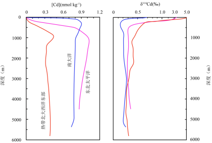 影响Cd同位素分馏的因素有很多,包括蒸发与冷凝、生物吸收、风化与吸附、共沉淀和络合作用等。其中海洋浮游植物可吸收Cd用于其生命活动,使其在海洋中具有类似于营养盐的分布特征,这种特征为应用沉积物中的Cd重建古海洋环境提供了依据。