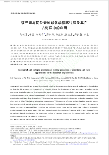 地科学院2025级地质学专业博士生刘健勇以第一作者身份在中文核心期刊《矿物岩石地球化学通报》上发表题为《镉元素与同位素地球化学循环过程及其在古海洋中的应用》论文。伟德国际1949官网为论文第一署名单位,博士生刘健勇为论文第一作者,其导师朱光有教授担任论文通讯作者。