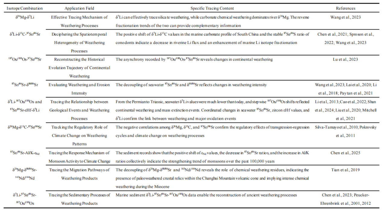 δ26Mg–δ7Li体系可有效示踪风化作用引起的同位素分馏机制,而87Sr/86Sr–δ88/86Sr组合则能够对风化与侵蚀强度进行定量评估(图4)。δ7Li–87Sr/86Sr三同位素方法可解析风化过程在时空尺度上的非均一性,187Os/188Os–87Sr/86Sr体系则用于重建大陆风化的演化历史。值得注意的是,δ7Li–187Os/188Os体系揭示了重大地质事件与风化过程之间的耦合关系,而δ26Mg–87Sr/86Sr则阐明了气候对风化格局的调控作用。87Sr/86Sr–δ41K体系可追踪季风对气候变化的响应,而δ26Mg–δ88/86Sr体系在示踪风化产物迁移路径方面具有独特优势。δ7Li–87Sr/86Sr–187Os/188Os的联合应用为理解从风化到沉积的连续过程提供了新的认识(表1)。