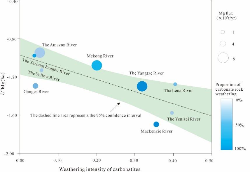图3 主要河流流域碳酸盐岩的风化强度与δ26Mg值之间的关系