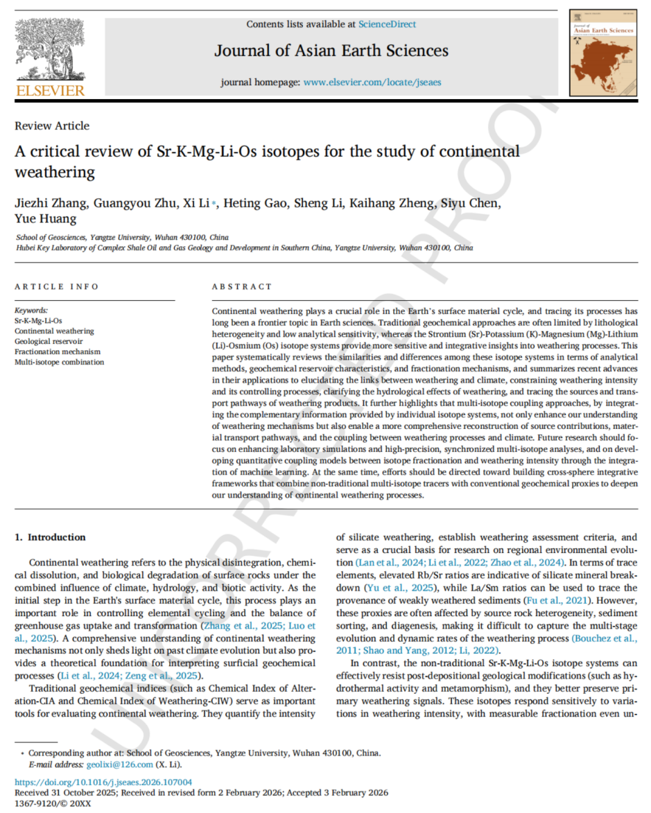 伟德国际1949官网24级硕士研究生张杰志以第一作者身份在国际期刊《Journal of Asian Earth Sciences》上发表了题为《A critical review of Sr-K-Mg-Li-Os isotopes for the study of continental weathering》的论文(图1),作者均来自伟德国际1949官网师生。论文重点讨论了锶-钾-镁-锂-锇同位素体系在分析方法、地球化学储库特征及分馏机制方面的异同,总结了它们在揭示风化与气候之间关系、约束风化强度及其控制过程、阐明风化的水文效应,以及追踪风化产物来源与迁移路径等方面的应用进展。