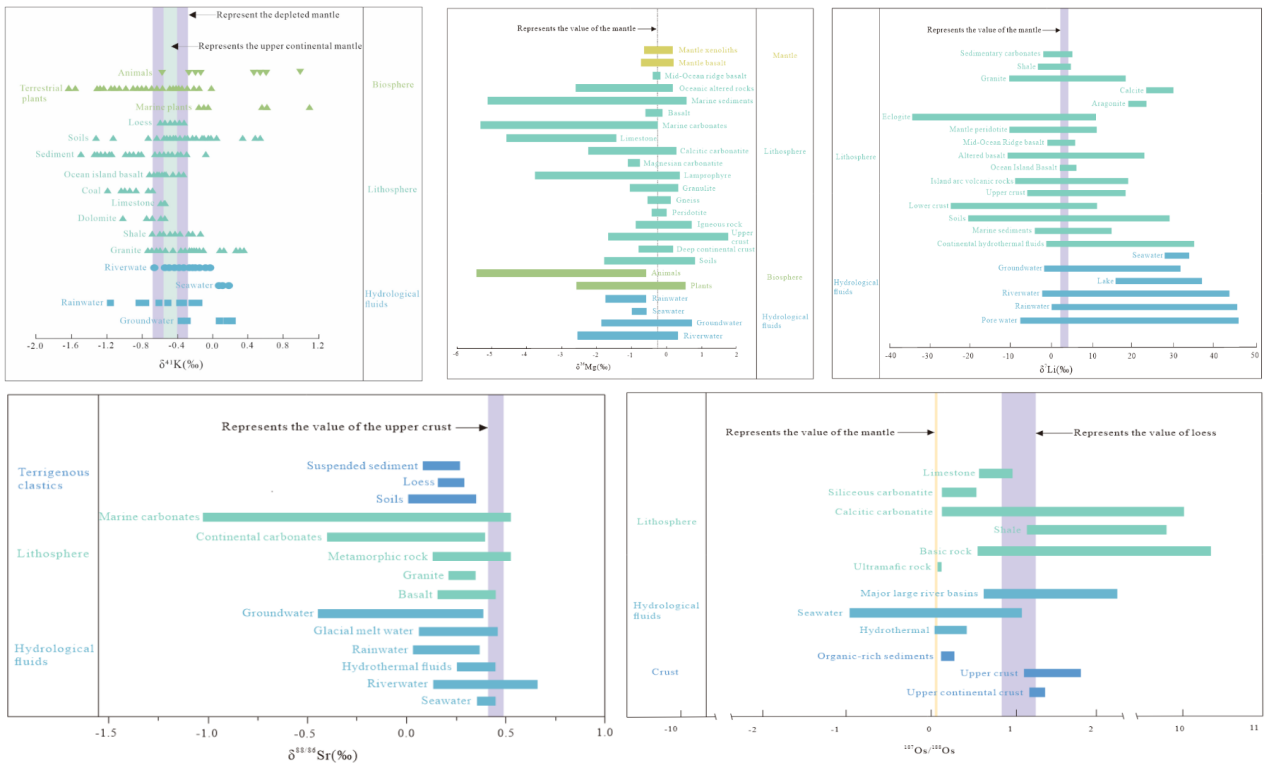 五种同位素体系在不同地质储库之间表现出组成差异(图2)。在分馏过程中,较重的Sr–Mg同位素主要保留在固相中,而较重的K–Li同位素则富集于流体相中。Os同位素组成受物源岩石信号的综合控制。这些特征为阐明和示踪风化过程提供了重要基础。