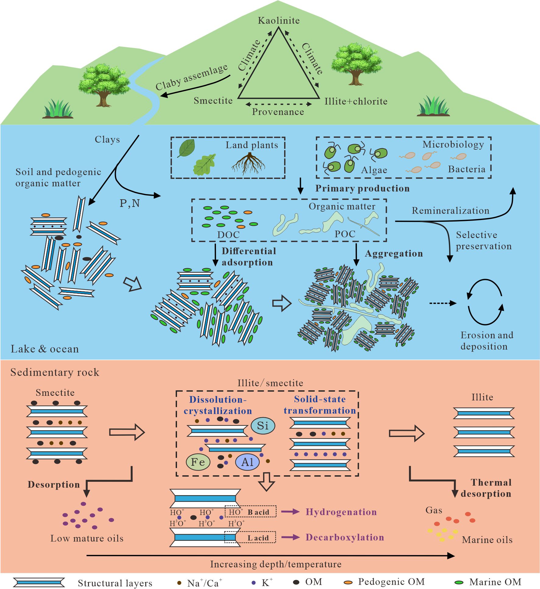 图2 黏土矿物沉积与成岩过程中有机 - 无机相互作用示意图(据Xu et al., 2024修改)