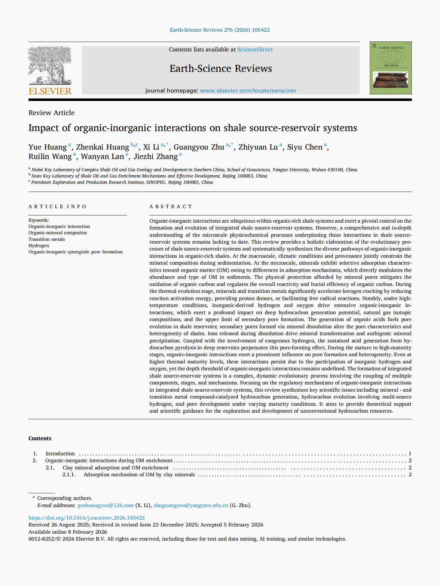 伟德国际1949官网2025级地质资源与地质工程专业硕士研究生黄月以第一作者身份在《Earth-Science Reviews》上发表题为“Impact of organic-inorganic interactions on shale source-reservoir systems”的论文(图1)。导师朱光有教授为通讯作者。论文总结了富有机质页岩中有机 - 无机相互作用的多元路径,探讨了其对页岩源储一体化体系形成与演化的调控机制。论文共27页。《Earth-Science Reviews》是一本国际顶尖期刊,影响因子10。