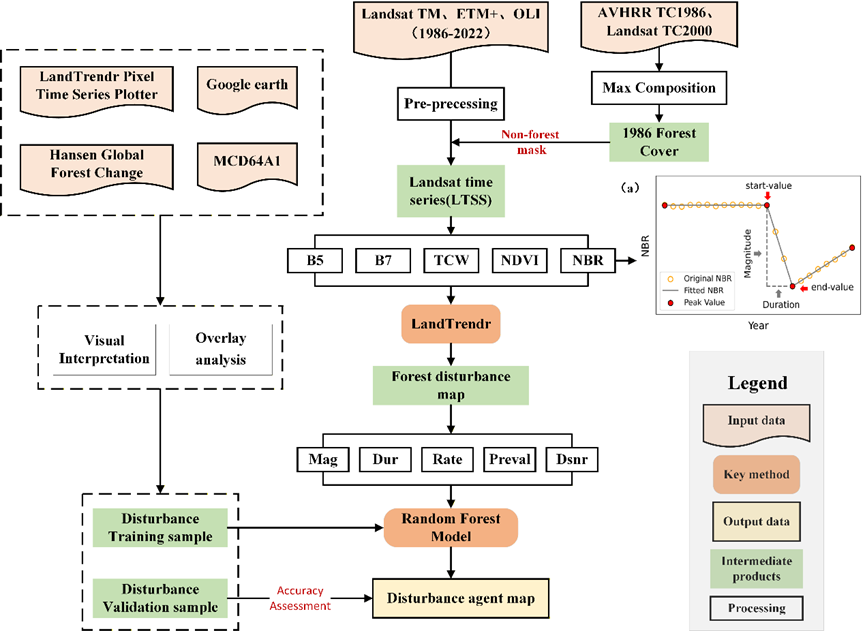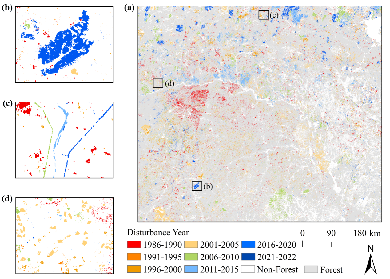 论文分析了1986-2022年中俄跨境地区北方森林的长期扰动动态与植被恢复情况。研究采用Landsat时间序列分析(LandTrendr)与机器学习(RF)相结合的综合框架,定量评估了不同驱动因子对森林扰动的影响。结果表明,过去37年间共检测到26561.34平方公里的森林扰动,占该地区森林总覆盖的16.93%。在所有扰动类型中,采伐是累计干扰面积最大的因素,占比达64.00%;火灾在2000年后成为关键且不断加剧的扰动源,占比为23.08%;人为扰动则占剩余的12.92%。研究期内,非火灾扰动(采伐和人为扰动)在2008年后呈明显下降趋势。在扰动后的植被恢复方面,高强度扰动后的植被光谱恢复率反直觉地超过了低强度事件。不同驱动因子的恢复轨迹差异显著,采伐区表现出最高的恢复潜力,而永久性人为扰动对森林再生的阻碍最为持久。