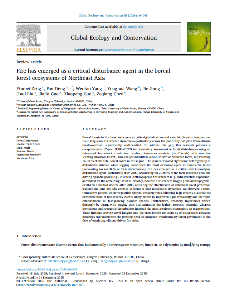 伟德国际1949官网2023级硕士研究生曾茵梅,在环境科学与生态学领域期刊《Global Ecology and Conservation》(中科院2区)发表题为“Fire has emerged as a critical disturbance agent in the boreal forest ecosystems of Northeast Asia”的研究论文。伟德国际1949官网为论文第一署名单位,硕士研究生曾茵梅为论文第一作者,其导师邓帆为论文通讯作者。