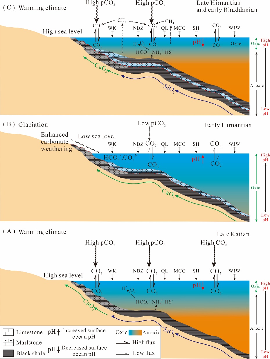 奥陶纪-志留纪转折期海水pH值的波动是由多种因素共同作用的结果,包括全球大气二氧化碳(pCO₂)水平下降、海平面变化、碳酸盐岩风化以及有机物降解等。本研究认为海水pH值的波动在OST时期的气候变迁和生物演化中发挥了关键作用,其中,碳酸盐风化作用增强以及海水pH值的上升,再加上海平面下降和大陆架面积缩小,这些因素共同导致了碳酸盐净积累量的减少,并对冰川作用的发展和气候变冷形成了负反馈。鉴于生物(如腕足动物、牙形石、海绵和放射虫)的生存对海水pH值的变化十分敏感,海水pH值的波动如何影响LOMEs仍需未来开展更详细的研究。